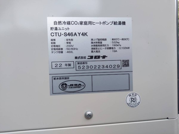 稲敷市高田 コロナ自然冷媒CO2家庭用ヒートポンプ給湯機 貯湯ユニットCTU-S46AY4K エコキュート交換工事|茨城県のエコキュート専門交換工事店|茨城エコキュート交換ショップ補助金対応可能