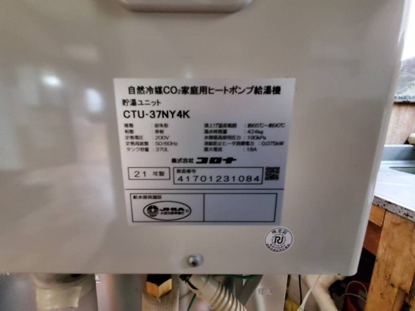 神栖市居切 コロナ自然冷媒CO2家庭用ヒートポンプ給湯機 貯湯ユニットCTU-E37AY4K、ヒートポンプユニットCHP-Y453K エコキュート交換工事