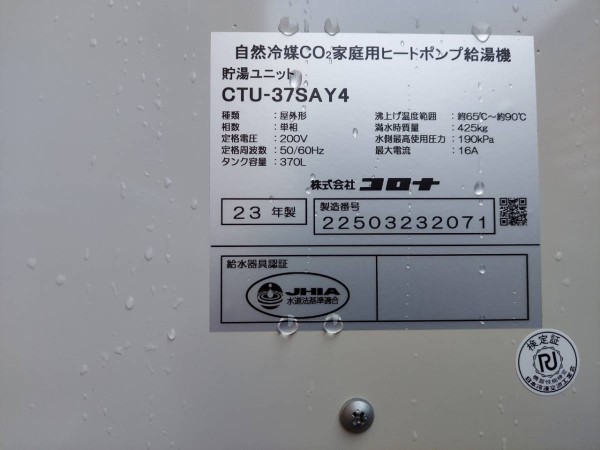 かすみがうら市加茂 コロナ自然冷媒CO2家庭用ヒートポンプ給湯機 貯湯ユニットCTU-37SAY4 エコキュート交換工事