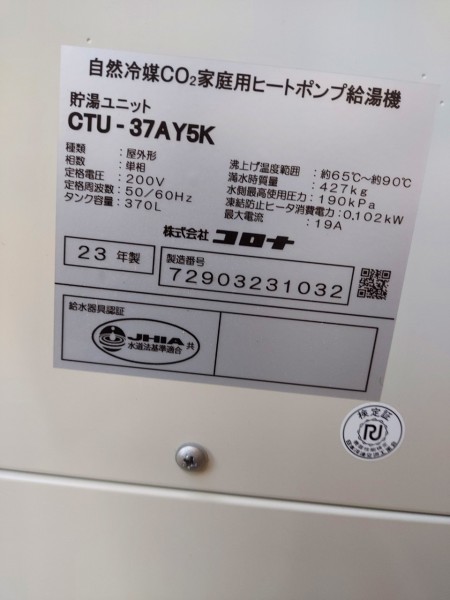 かすみがうら市加茂 コロナ自然冷媒CO2家庭用ヒートポンプ給湯機貯湯ユニットCTU-37AY5K、ヒートポンプユニットCHP-Y454K エコキュート交換工事|茨城県のエコキュート専門交換工事店|茨城エコキュート交換ショップ補助金対応可能
