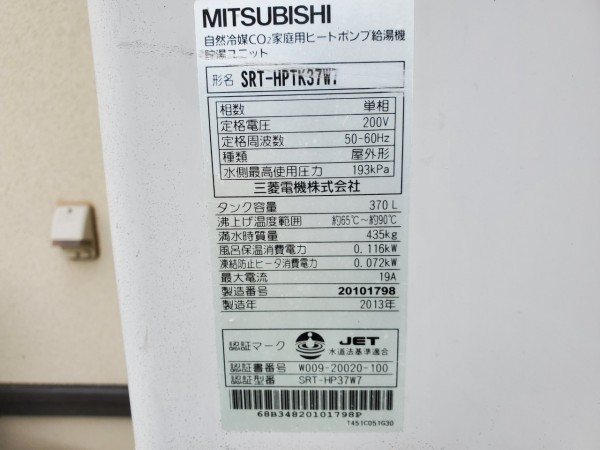 稲敷市押砂 三菱電機エコキュートSRT-HPTK37WT→コロナ自然冷媒CO2家庭用ヒートポンプ給湯機貯湯ユニットCTU-37AY5K エコキュート交換工事