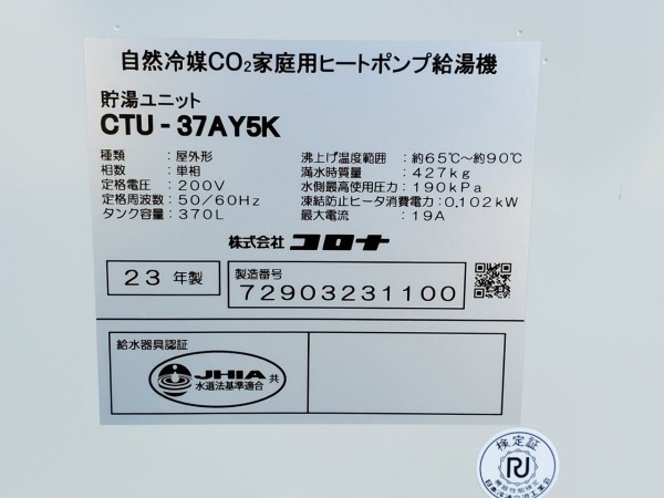 稲敷市押砂 コロナ自然冷媒CO2家庭用ヒートポンプ給湯機貯湯ユニットCTU-37AY5K エコキュート交換工事