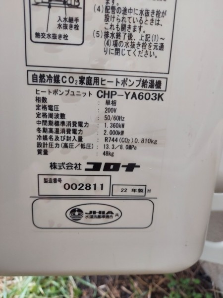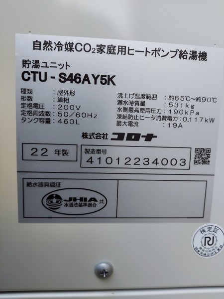 稲敷市高田 コロナエコキュート→コロナ自然冷媒CO2家庭用ヒートポンプ給湯機貯湯ユニットCTU-S46AY5K エコキュート交換工事