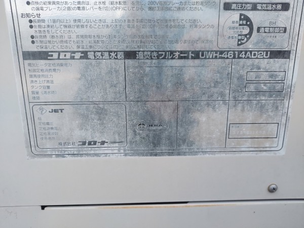 鹿嶋市泉川 コロナ電気温水器UWH-4614AD2U→コロナ自然冷媒CO2家庭用ヒートポンプ給湯機貯湯ユニットCTU-S46AY5K エコキュート交換工事