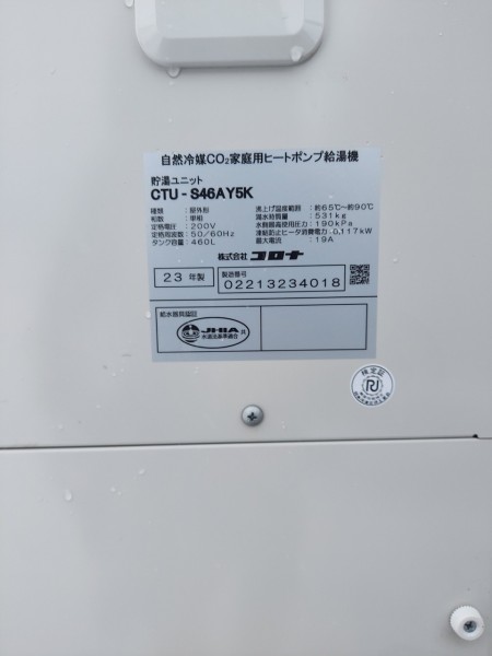 鹿嶋市泉川 コロナ自然冷媒CO2家庭用ヒートポンプ給湯機貯湯ユニットCTU-S46AY5K エコキュート交換工事