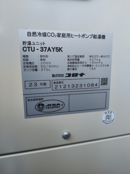 稲敷市押砂 コロナ自然冷媒CO2家庭用ヒートポンプ給湯機貯湯ユニットCTU-37AY5K エコキュート交換工事