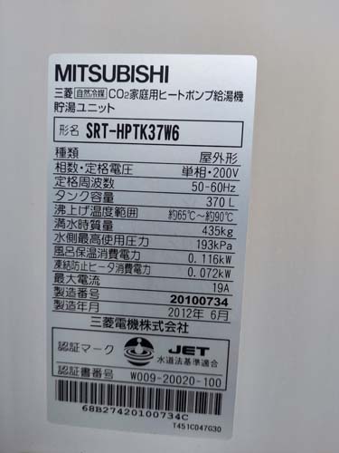笠間市仁古田 三菱電機エコキュート→コロナ自然冷媒CO2家庭用ヒートポンプ給湯機 ヒートポンプユニットCHP-DZ451K エコキュート交換工事
