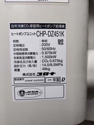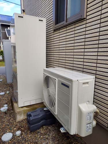 笠間市仁古田 コロナ自然冷媒CO2家庭用ヒートポンプ給湯機 ヒートポンプユニットCHP-DZ451K エコキュート交換工事