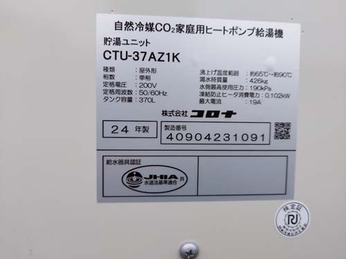 鹿嶋市須賀 コロナ自然冷媒CO2家庭用ヒートポンプ給湯機 貯湯ユニットCTU-37AZ1K エコキュート交換工事