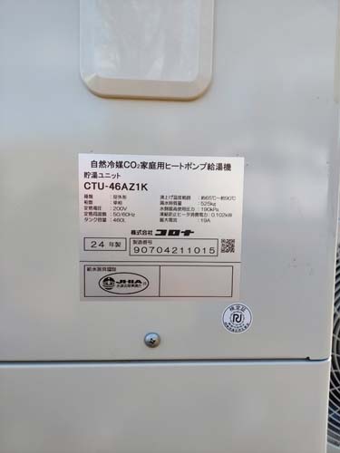 牛久市福田町 コロナエコキュート→コロナ自然冷媒CO2家庭用ヒートポンプ給湯機貯湯ユニットCTU-46AZ1K エコキュート交換工事