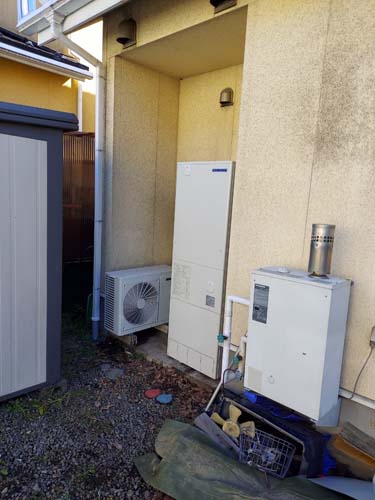 トップページ > 工事事例一覧 > 笠間市泉 コロナ自然冷媒CO2家庭用ヒートポンプ給湯機貯湯ユニットCTU-37AZ1K、ヒートポンプユニットCHP-DZ451K エコキュート交換工事