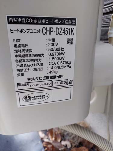 牛久市福田町 三菱電機エコキュート→コロナ自然冷媒CO2家庭用ヒートポンプ給湯機貯湯ユニットCTU-37AZ1K、ヒートポンプユニットCHP-DZ451K エコキュート交換工事