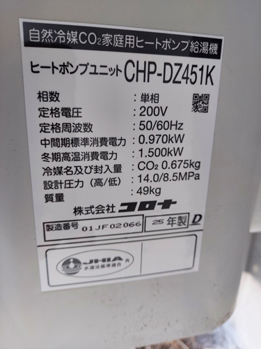 稲敷市阿波 コロナ自然冷媒CO2家庭用ヒートポンプ給湯機 ヒートポンプユニットCHP-DZ451K エコキュート交換工事|茨城県のエコキュート専門交換工事店|茨城エコキュート交換ショップ補助金対応可能