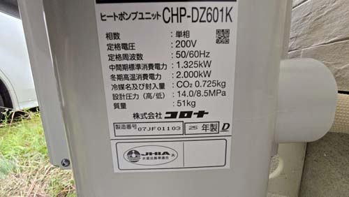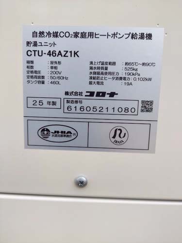 潮来市清水 コロナ自然冷媒CO2家庭用ヒートポンプ給湯機 ヒートポンプユニットCHP-DZ601K、貯湯ユニットCTU-46AZ1K エコキュート交換工事